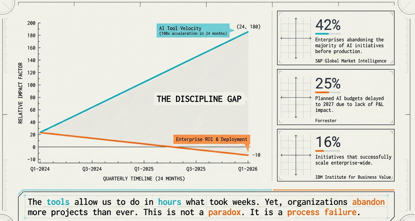 L’écart de vélocité entre une équipe équipée en avril 2026 et une équipe fonctionnant au rythme de 2024 est passé d’un facteur 2 à un facteur 100 en vingt-quatre mois. L’écart d’abandon est passé de 17% à 42% sur la même fenêtre. La compression des cycles discovery-delivery n’est pas la même chose que la traction marché. Une cellule innovation qui génère 200 variantes sans discipline produit tombe dans les 42% d’abandons. Une cellule qui compresse et cadre tombe dans les 25% qui atteignent le ROI.