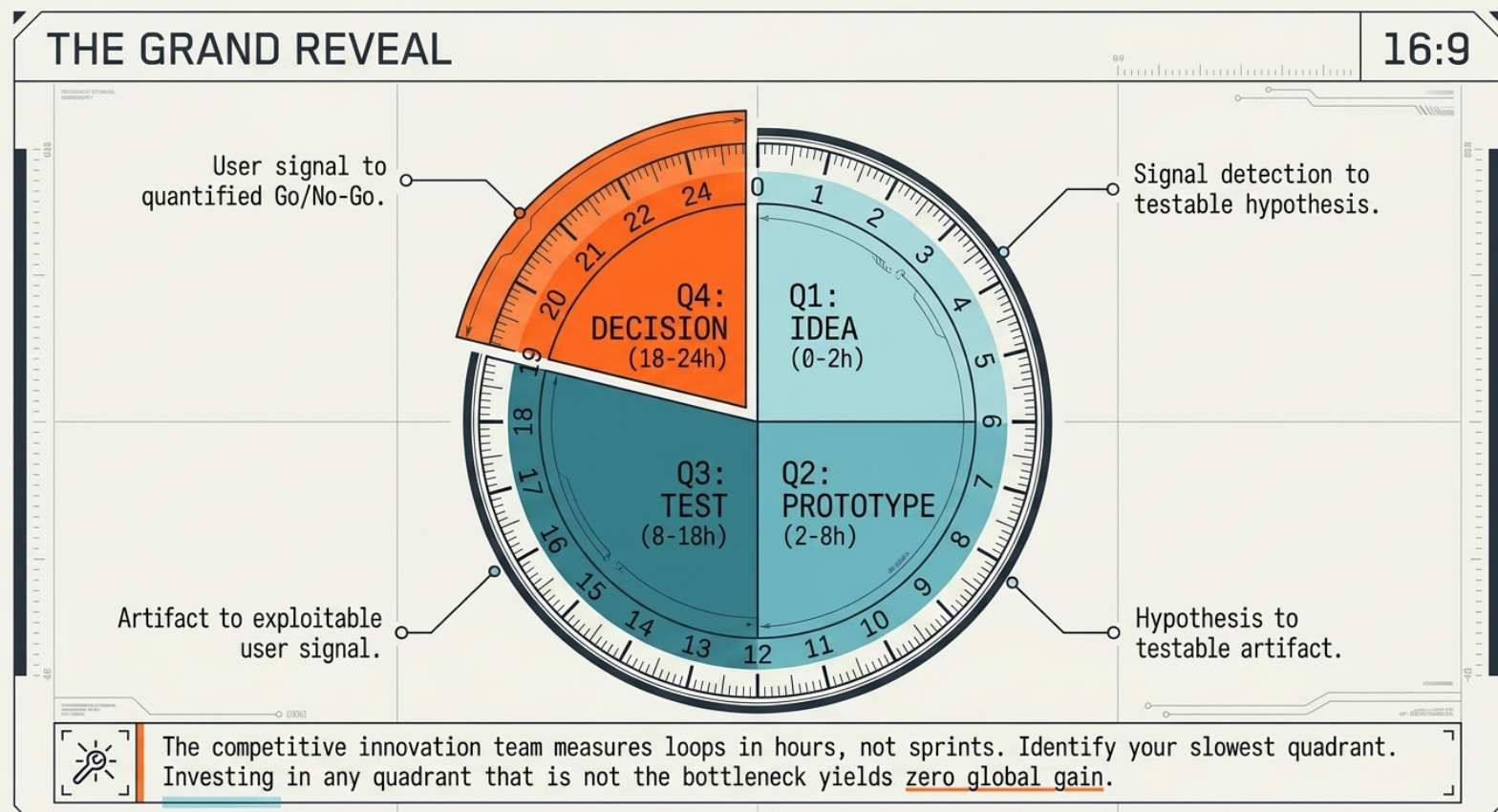 La boucle discovery-delivery en 2026 ne se mesure plus en semaines ni en sprints. Elle se mesure en heures. L’équipe innovation compétitive opère sur quatre quadrants distincts, chacun chronométré. Le Compression Clock identifie le quadrant le plus lent et pose un benchmark à 24 heures pour un tour complet.