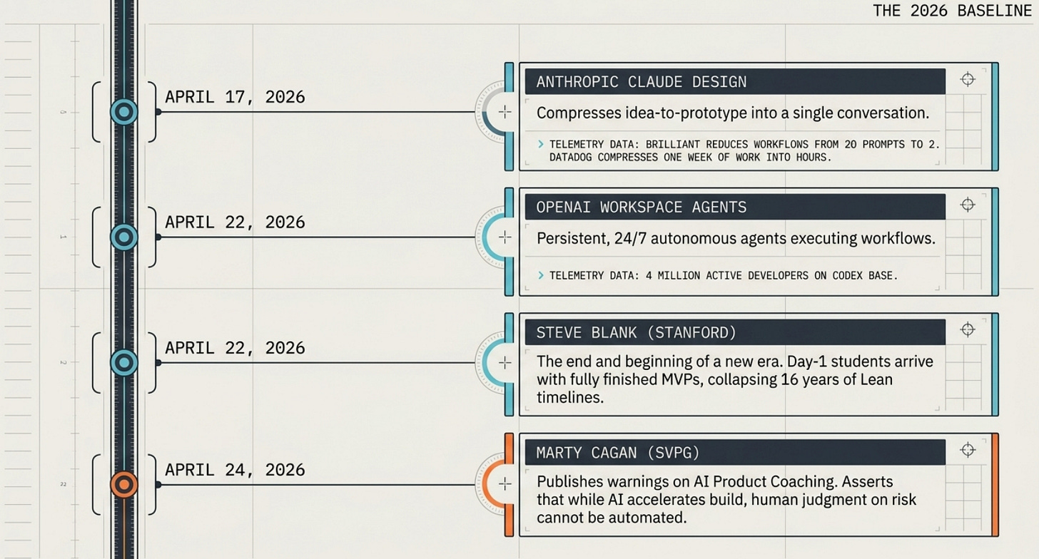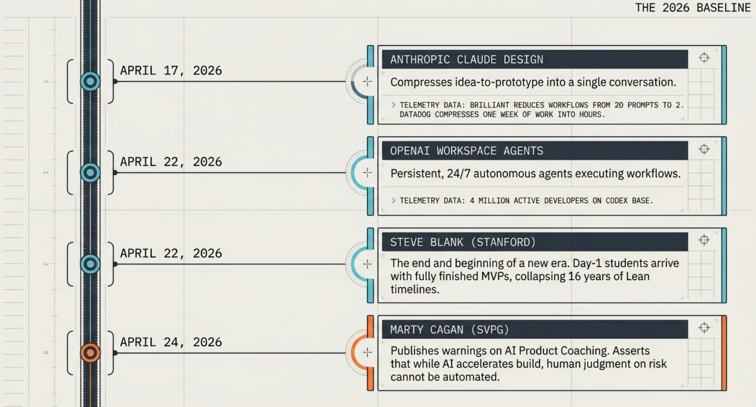 Steve Blank observe dans son article du 22 avril 2026 que la seizième année du Lean LaunchPad marque un basculement. Les équipes étudiantes arrivent au premier jour avec des MVP qui ressemblent à des produits finis. Citation : “8 teams actually implementing AI was mind blowing. And not a single team thought they were doing anything extraordinary.” Pour un CIO ou un directeur innovation, c’est la preuve académique la plus solide disponible en 2026 que la compression est structurelle, pas une promesse vendor. Blank n’est pas un commentateur LinkedIn, c’est l’inventeur du Customer Development qui observe en direct l’effondrement du cycle qu’il enseigne depuis seize ans.