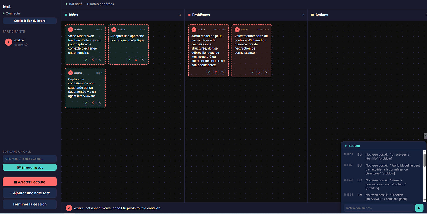 BoardBot part de ces deux constats. Je garde la méthodologie de facilitation classique, on reste sur un format présentiel avec des gens qui se parlent, sans obligation d’être tous sur un ordinateur. Mais l’outil écoute la conversation en temps réel, identifie qui parle par diarization, et génère automatiquement des post-it dans les bonnes catégories, idée, problème, action. Les participants voient leur propre pensée collective s’afficher sur un écran géant au fil de la discussion. C’est un effet miroir, très proche de ce qu’un Miro ou un Mural permet, sauf que personne n’a besoin de taper quoi que ce soit.