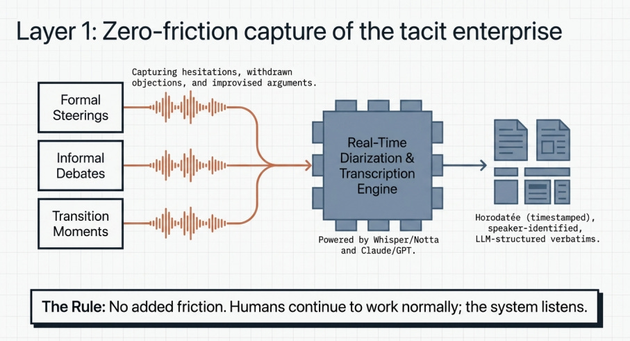 Cette couche a trois propriétés que rien d’autre ne donne. Elle capture de la connaissance tacite que les documents ne portent jamais, les nuances, les hésitations, les objections soulevées puis retirées, les arguments improvisés qui se révèlent justes. Elle opère en continu, pas par événements, le World Model s’enrichit à chaque réunion, pas à chaque rédaction de compte rendu. Et elle ne demande aucun effort supplémentaire aux participants, on continue à travailler normalement, le système capte ce qui se dit.
