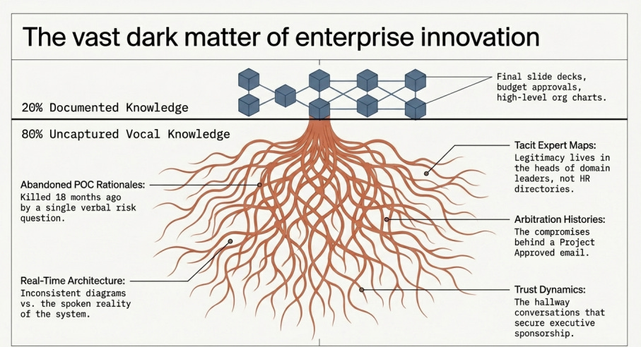 Dans une grande entreprise, la connaissance d’innovation n’est documentée nulle part sous forme exploitable. Ce n’est pas un problème de maturité qui va se résoudre avec le temps. C’est une propriété structurelle du travail d’innovation.