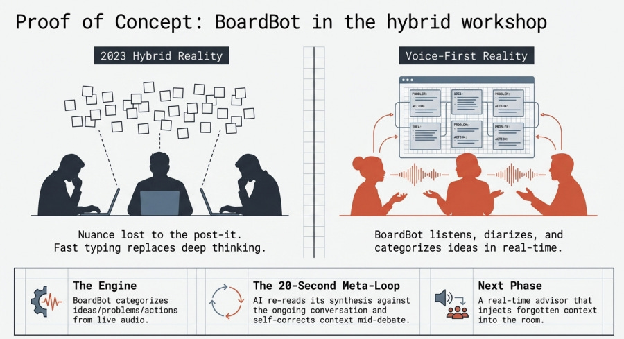 Le workshop d’innovation, c’est le premier terrain naturel du Voice Layer. J’ai construit un prototype pour le tester. Il s’appelle BoardBot. Il est accessible en beta à l’adresse boardbot.onrender.com, gratuitement, tant que la charge token reste raisonnable.
