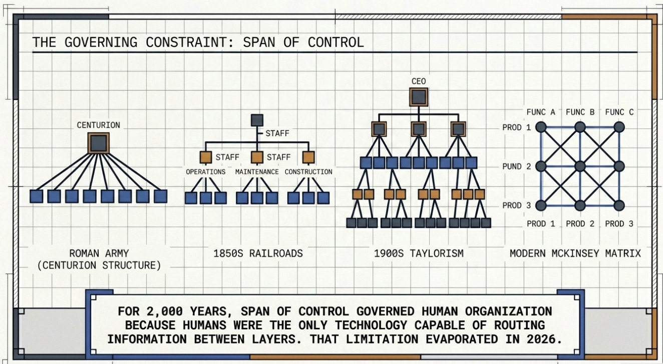 Dorsey remonte loin pour le démontrer. Il rappelle que l’armée romaine avait déjà résolu le problème : coordonner des milliers de personnes à travers des distances vastes avec une communication limitée. Huit soldats sous un decanus, dix contubernia sous un centurion, six centuries sous une cohorte. Cette structure n’était pas un organigramme. C’était un protocole de routage d’information construit autour d’une limitation humaine : un leader peut gérer efficacement entre trois et huit personnes. Les Prussiens ont formalisé ça au XIXe siècle avec la distinction entre les fonctions de ligne et les fonctions d’état-major. Les chemins de fer américains l’ont importé dans l’entreprise dans les années 1850. Frederick Taylor l’a optimisé. McKinsey l’a raffiné avec la matrice. Mais l’idée n’a jamais changé : des humains routent de l’information entre des couches hiérarchiques, parce qu’aucune autre technologie ne pouvait le faire.