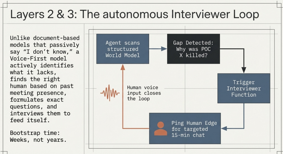 Là où ça devient puissant, c’est que la fonction Interviewer résout le problème d’amorçage. Tous les projets World Model documentaires classiques en entreprise meurent de la même chose : on ne peut pas démarrer avec un World Model vide parce qu’il ne peut rien répondre. Avec un Voice Layer qui capte en continu et un Intelligence Layer qui interview activement, l’amorçage se fait en quelques semaines. Pas en années.