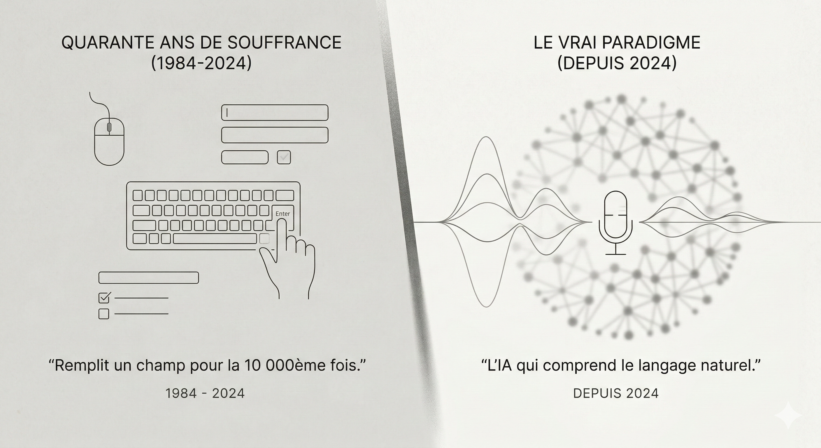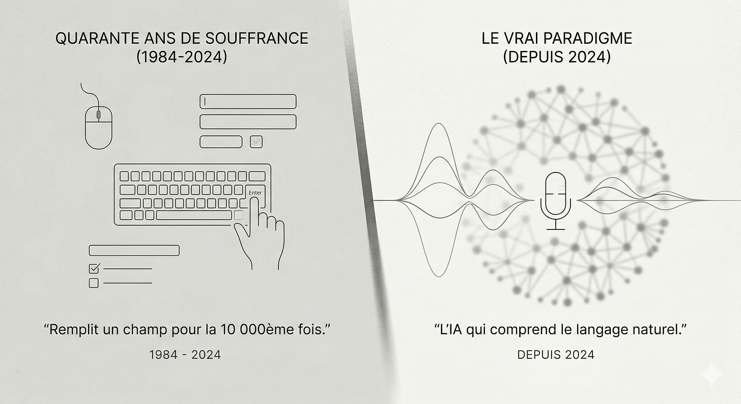 40 ans de clics. 40 ans de formulaires. 40 ans d’interfaces qui demandent à l’humain de parler la langue de la machine.