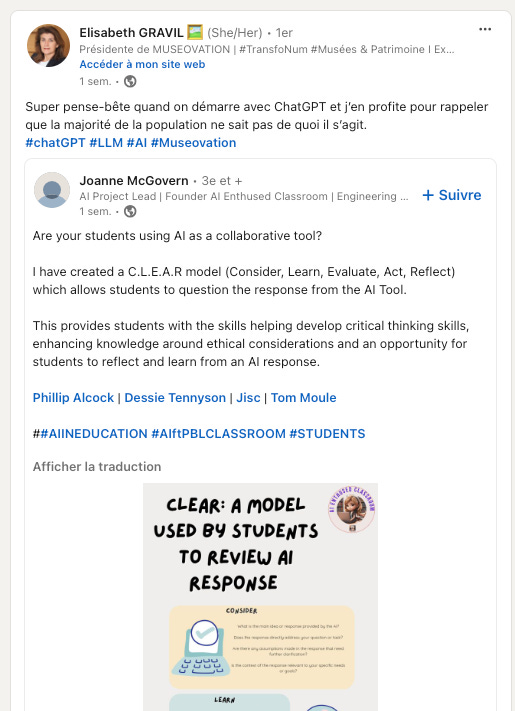 Elisabeth Gravil : à suivre absolument car elle partage régulièrement sur Linkedin des tutos et des retours d’experimentation sur des outils d’IA générative en lien avec la créativité