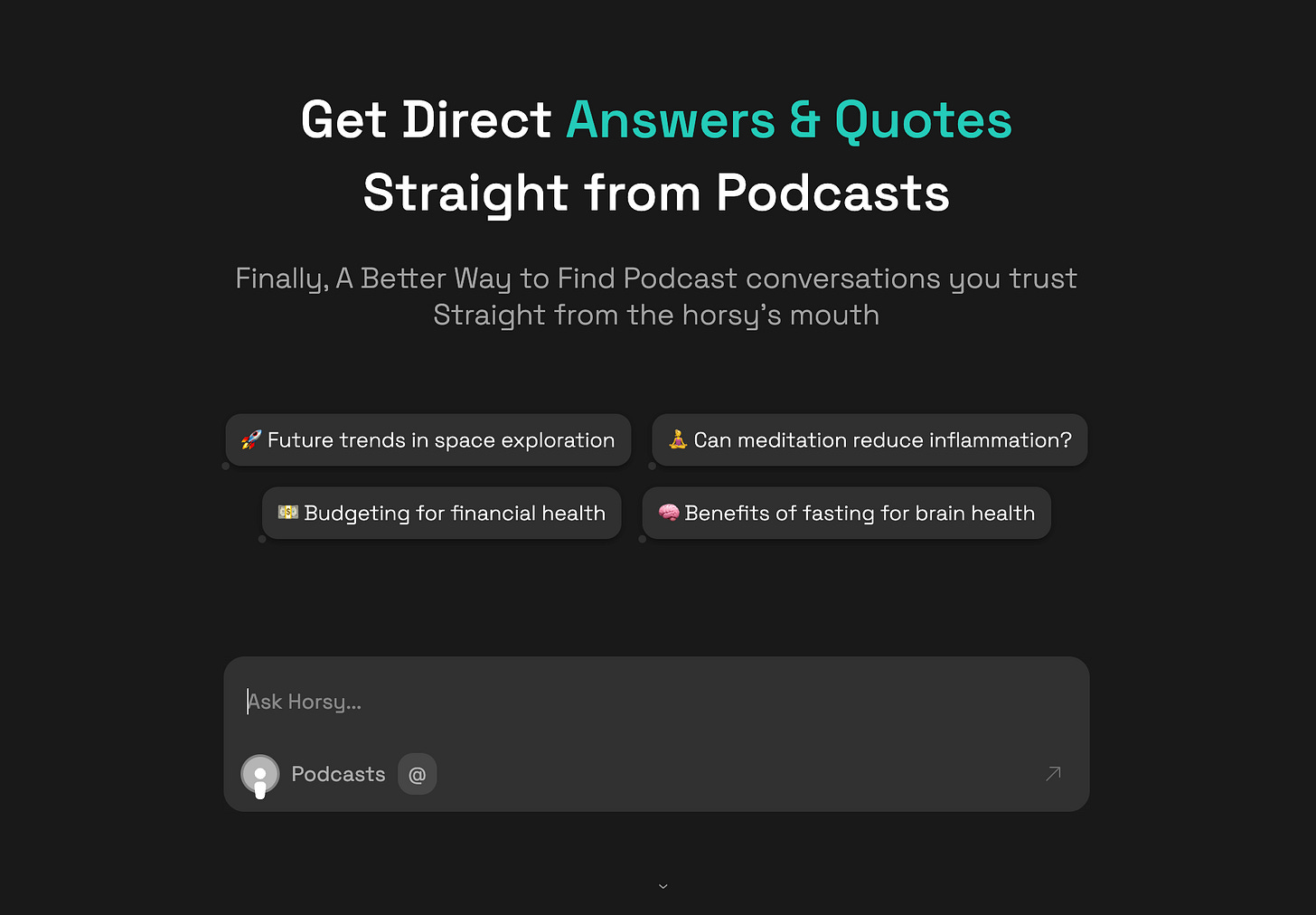 Horsy.ai, c’est l’outil parfait pour explorer la connaissance cachée d’Internet. Un peu comme Perplexity, il permet de plonger dans les podcasts et vidéos YouTube pour en extraire des informations, en fouillant dans les transcripts. En gros, tu tapes ta question et ça te trouve les pépites d’infos enfouies. Idéal pour ceux qui, comme moi, veulent aller plus loin et choper des insights dans des coins d’Internet que l’algorithme de Google ne sait pas toujours bien explorer.