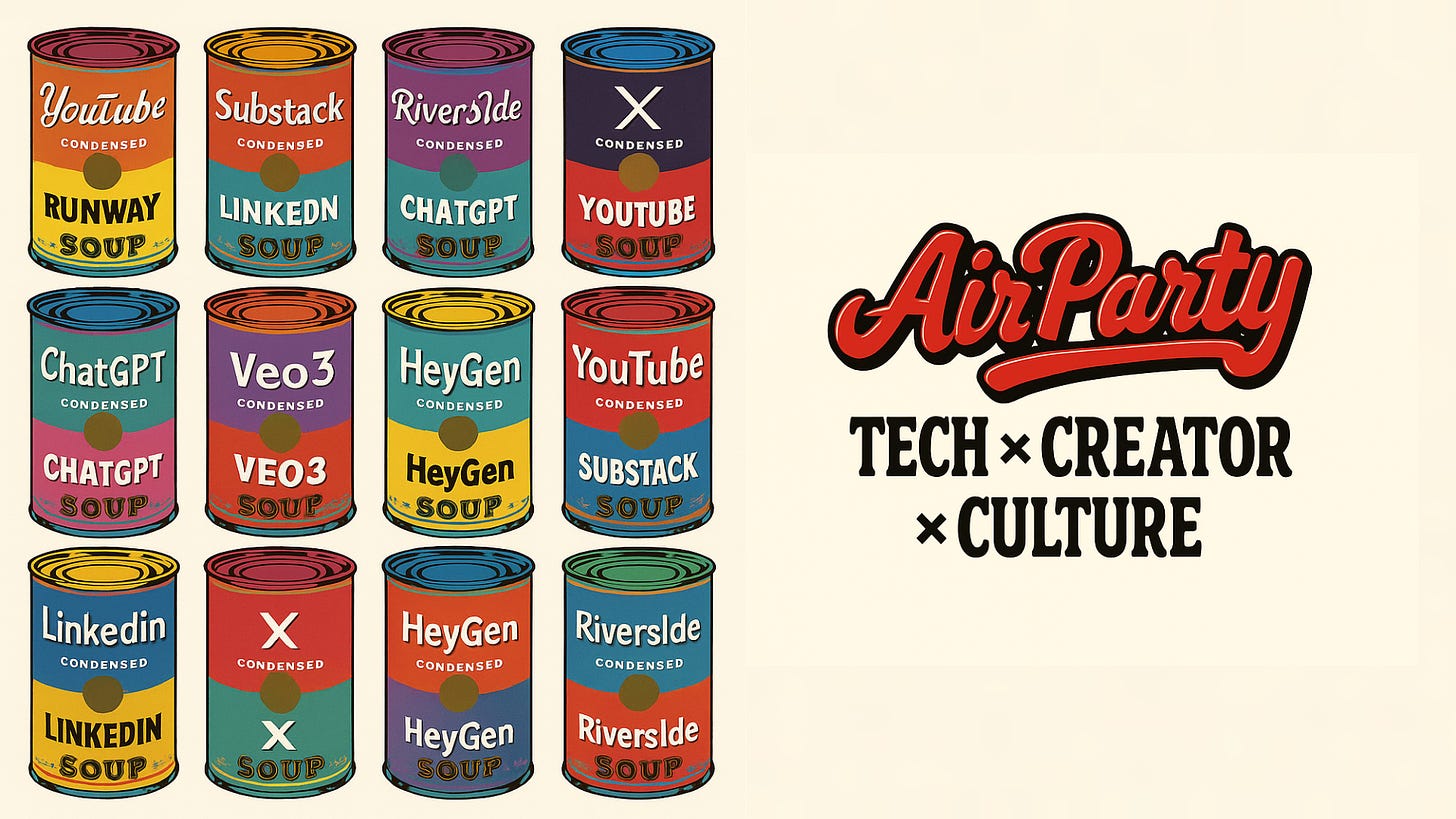 AirParty, c’est une newsletter hebdomadaire et des podcasts qui décodent les dernières tendances, outils et formats qui façonnent concrètement le métier de créateur de contenu aujourd’hui. On parle d’IA créative, de nouvelles plateformes vidéo, de formats émergents, de workflows automatisés... Bref, tout ce qui aide à produire plus vite, mieux, différemment — et toujours de manière très concrète.